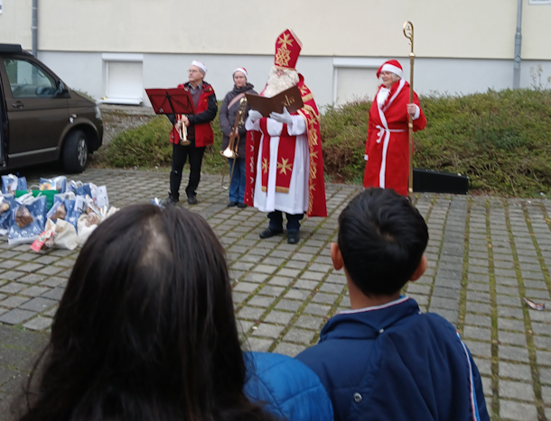 Wie schon seit einigen Jahren organisierte auch dieses Jahr Erika Eichwald den Besuch des Nikolaus bei den Kindern der Flüchtlingsunterkünfte. Musikalisch untermalt von den Bläsern der evangelischen Kirche brachte der Nikolaus liebevoll verpackte Geschenke für 45 Kinder. Die freuten sich riesig und staunten über den heiligen Mann. Die Bürgerstiftung Weingarten unterstützte neben dem DM-Markt Weingarten, Privatleuten und der Welfenapotheke die private Aktion von Frau Eichwald gerne mit 380,-€.